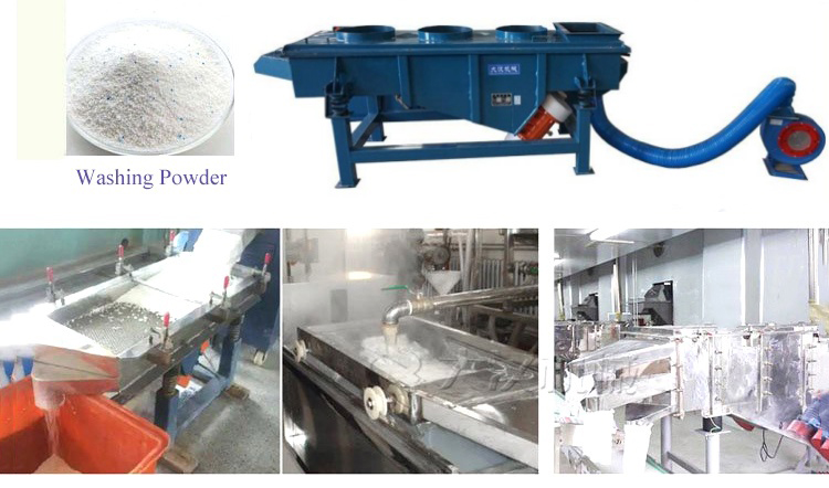 大漢機(jī)械降溫直線振動(dòng)篩這對(duì)高溫特性物料設(shè)計(jì)研發(fā),可在有效降低物料溫度后再對(duì)物料進(jìn)行篩分,有效的提高了篩分效率及處理量,下面以洗衣粉為例說明風(fēng)冷式振動(dòng)篩的應(yīng)用。洗衣粉在剛剛完成生產(chǎn)后,通常為120度左右的高溫,如不進(jìn)行降溫處理,篩選分級(jí)非常困難,而洗衣服不適合傳統(tǒng)的水冷式降溫。在洗衣粉生產(chǎn)線上用“大漢牌”風(fēng)冷式直線振動(dòng)篩,剛生產(chǎn)完成120度高溫洗衣粉通過輸送設(shè)備直接進(jìn)入風(fēng)冷式直線振動(dòng)篩,經(jīng)過安裝在設(shè)備進(jìn)料口底部的風(fēng)機(jī)降溫冷卻系統(tǒng),(不符合要求的結(jié)塊物料通過安裝在進(jìn)料口端的篩網(wǎng)篩選后從出料口旁的小型排料口排出,見下圖,該裝置可根據(jù)物料特性選裝),可直接將洗衣粉溫度降至40-50度后再進(jìn)入直線振動(dòng)篩完成篩選分級(jí)工作。