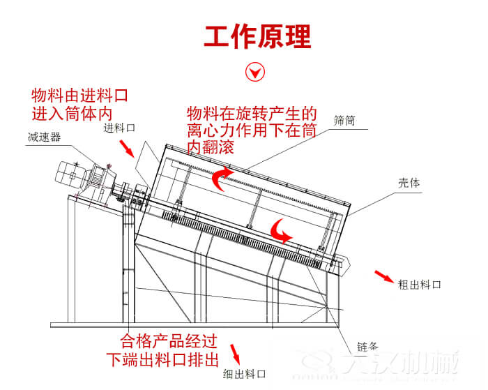 電機驅動滾筒軸線作旋轉運動,減速機調節(jié)筒體以一定的轉速旋轉,物料由進料口進入筒體內,在旋轉產生的離心力作用下,物料在筒內翻滾,自上而下通過分級篩網析出,由于篩網分級尺寸不同,物料逐漸被分離篩選,粒度合格的物料經篩分后落入到各自的漏斗,然后由人力方式運出或通過輸送機自流送往成品站。合格產品經過下端出料口排出,顆粒較大,分選不合格的產品經另一排料口排出,筒內清理裝置,使篩網不宜被阻塞。